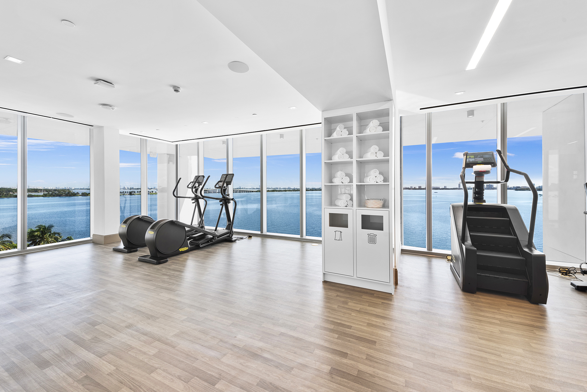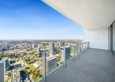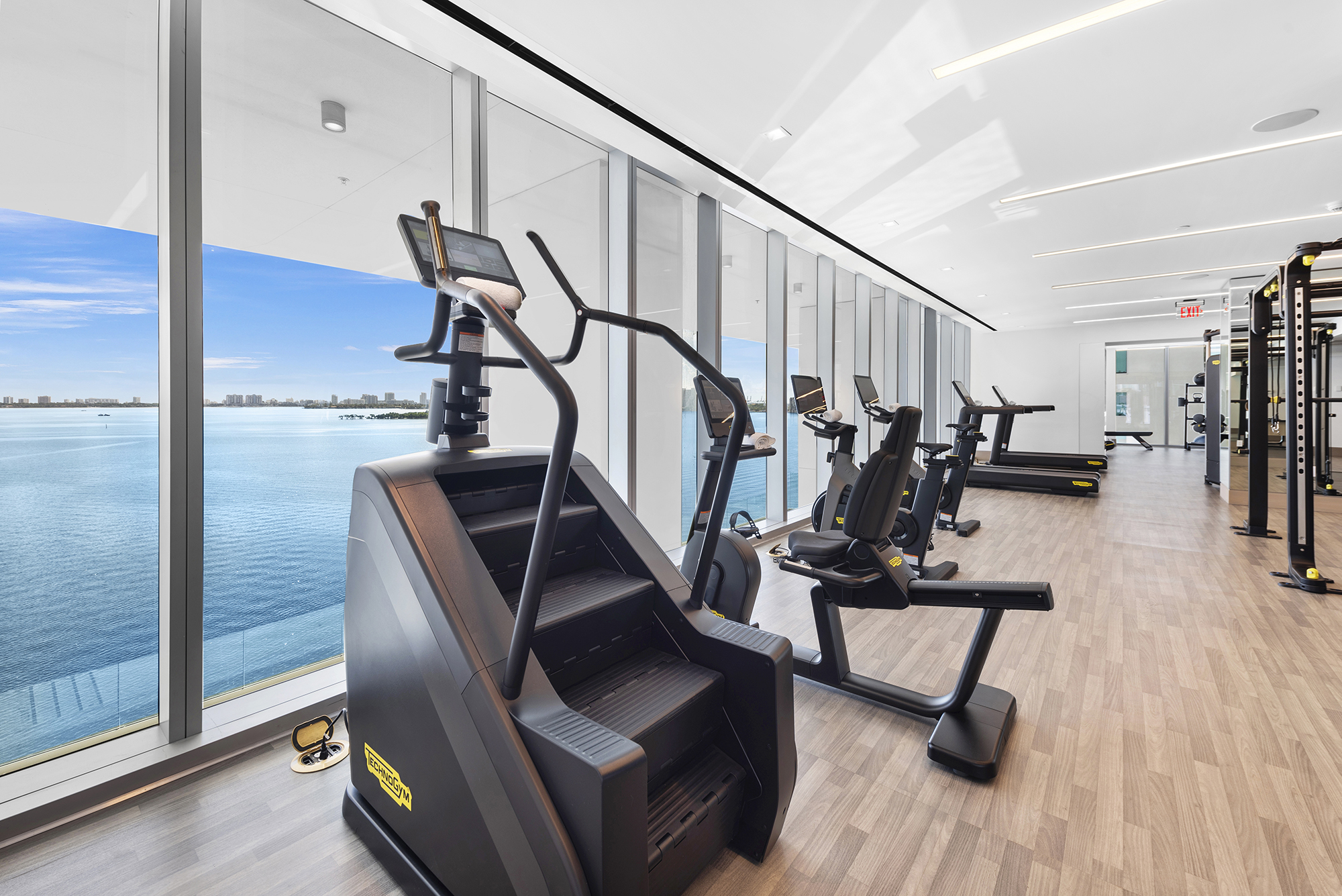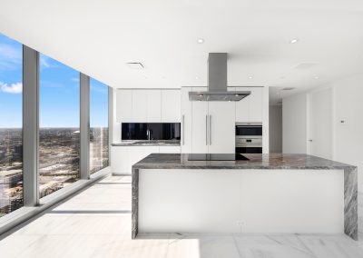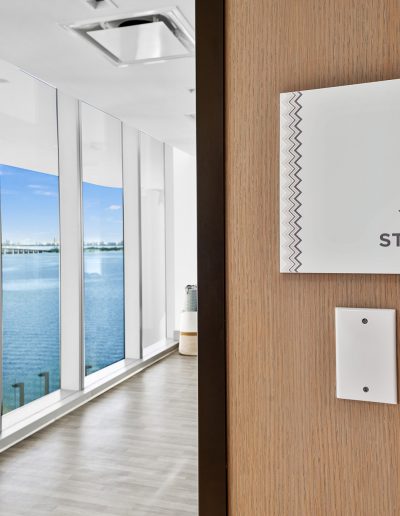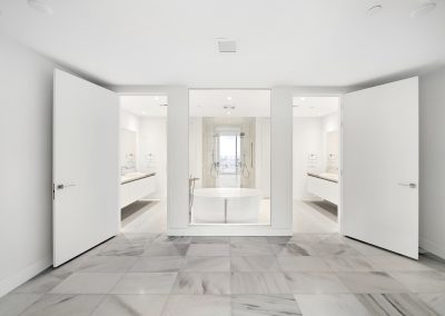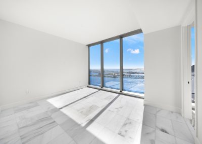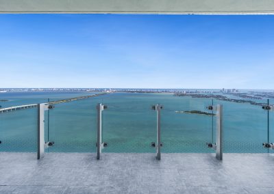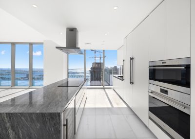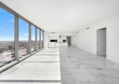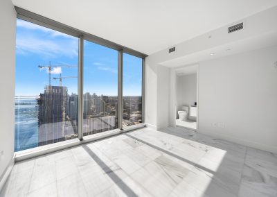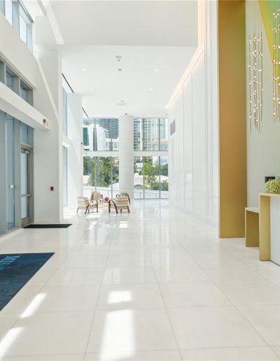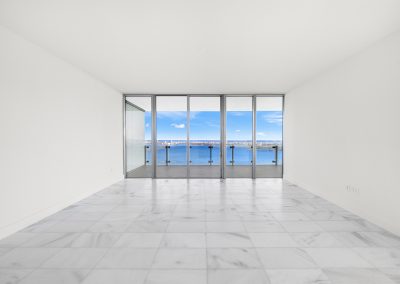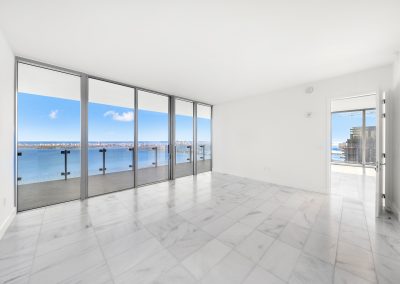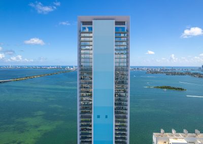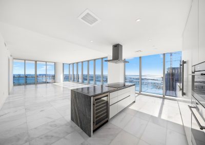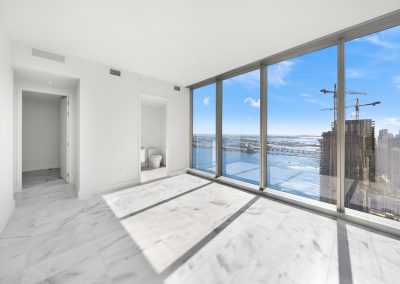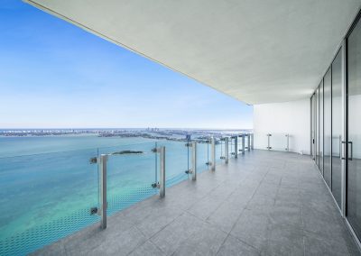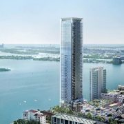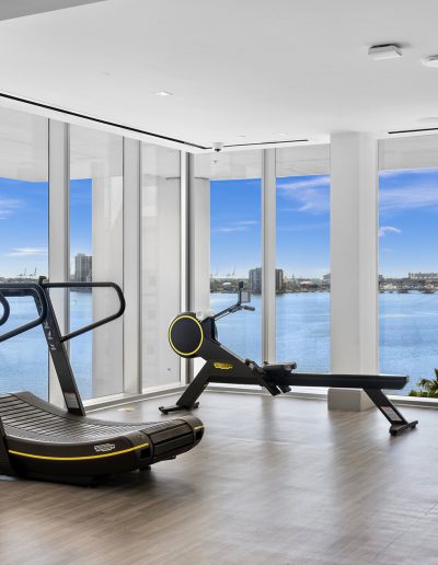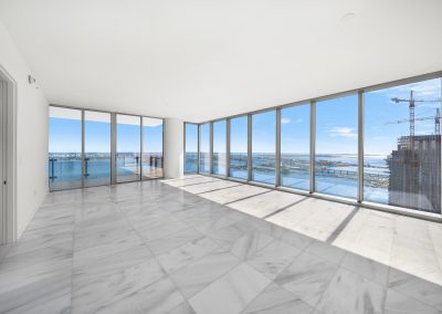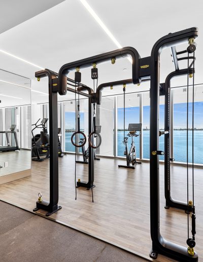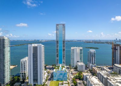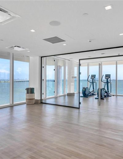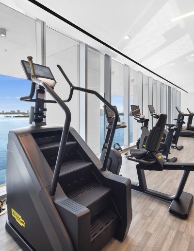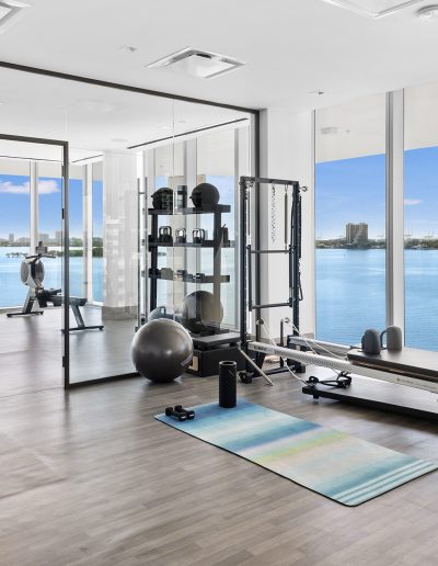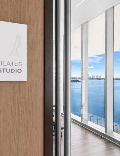 On floors 5 though 7, amenities include a bayfront lounge with a pool overlooking the water; a media room; a beauty salon; a children’s playroom; a pet spa; an expansive gym overlooking the bay; and one of Miami’s largest, resident-only spas. An outdoor bridge connects the sixth floor’s indoor amenities suite to the flow-through pool deck, which includes cabanas, an Olympic-sized lap pool, plunge pools, children’s water features, and an elevated tennis court.