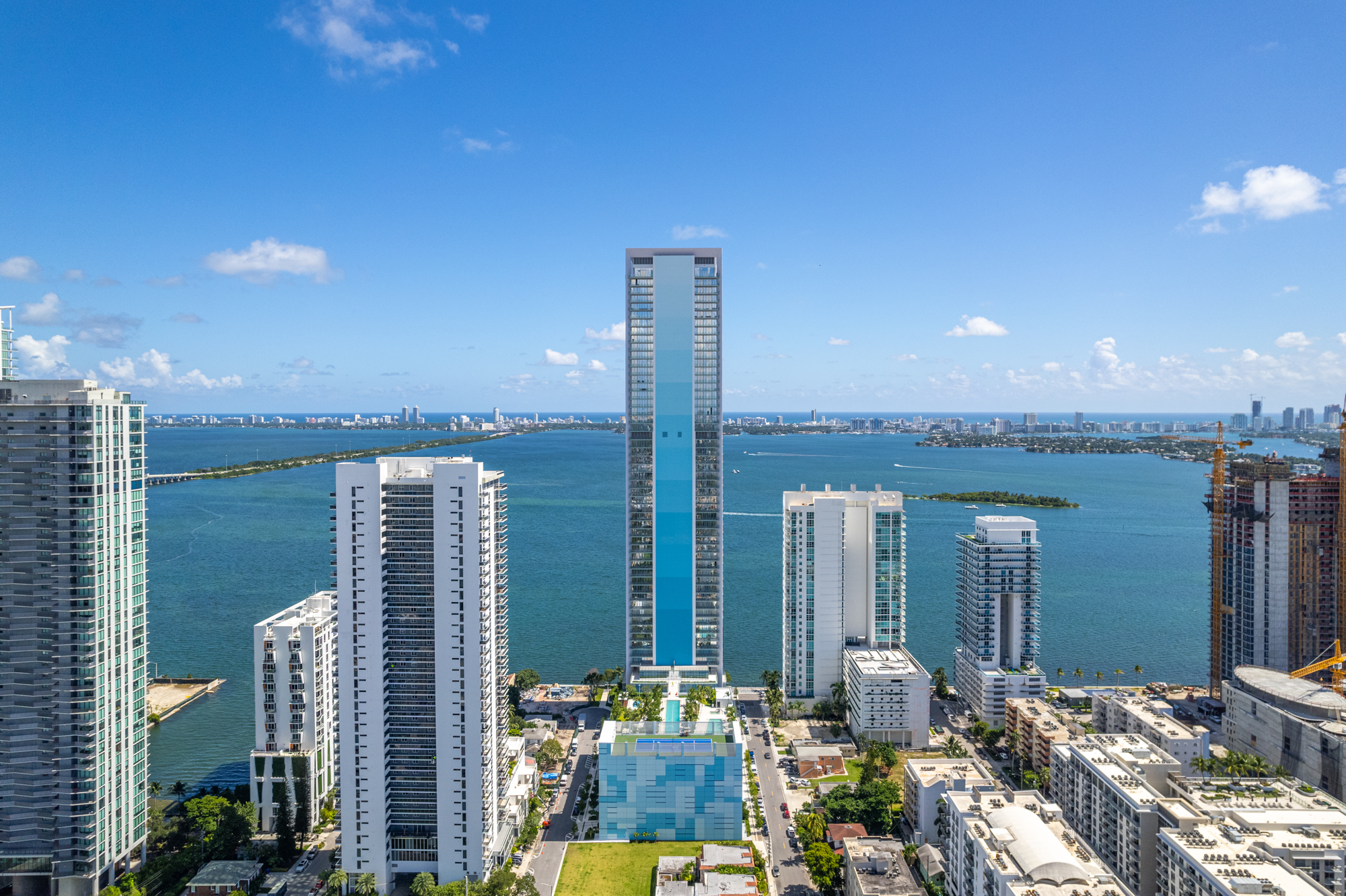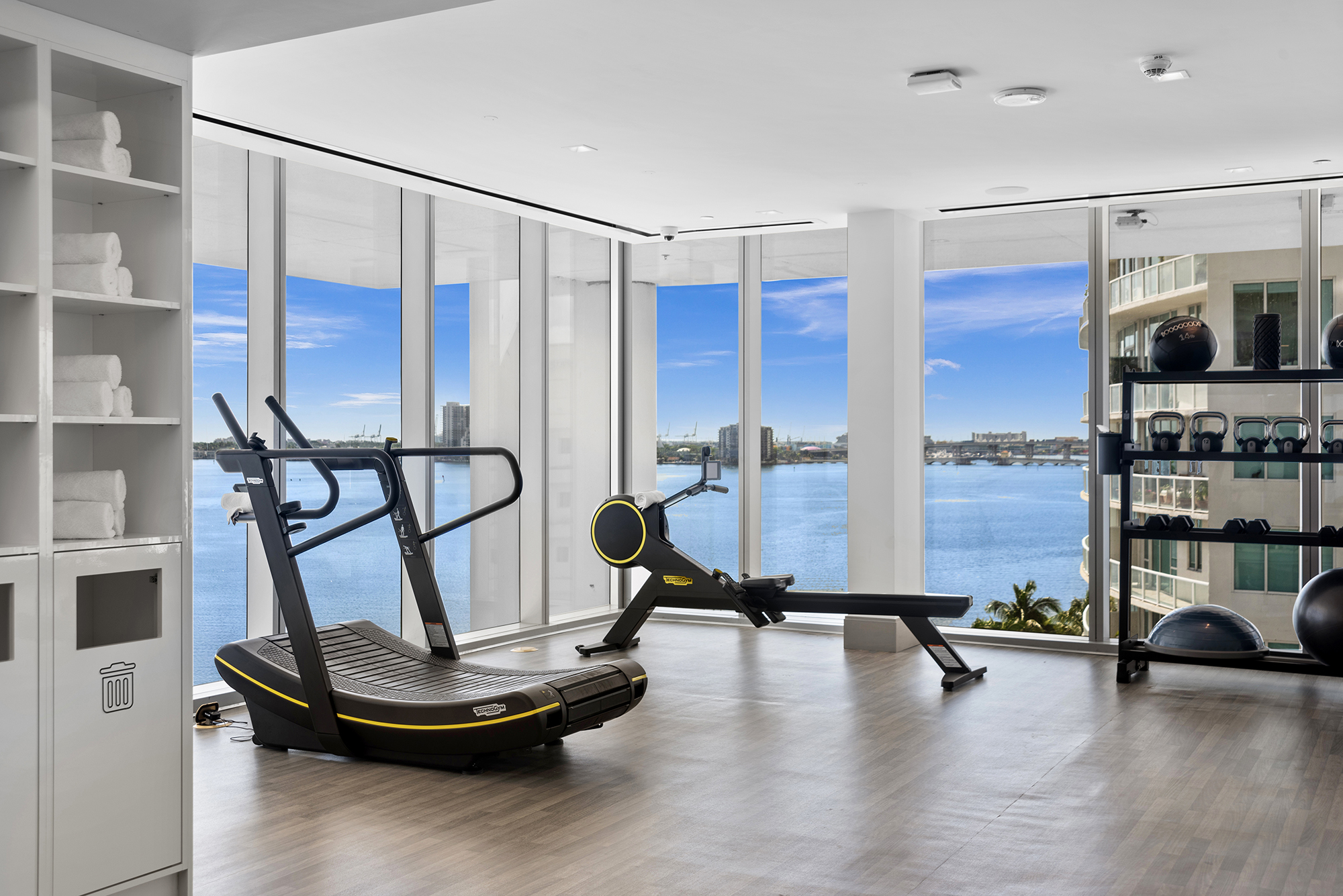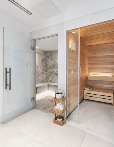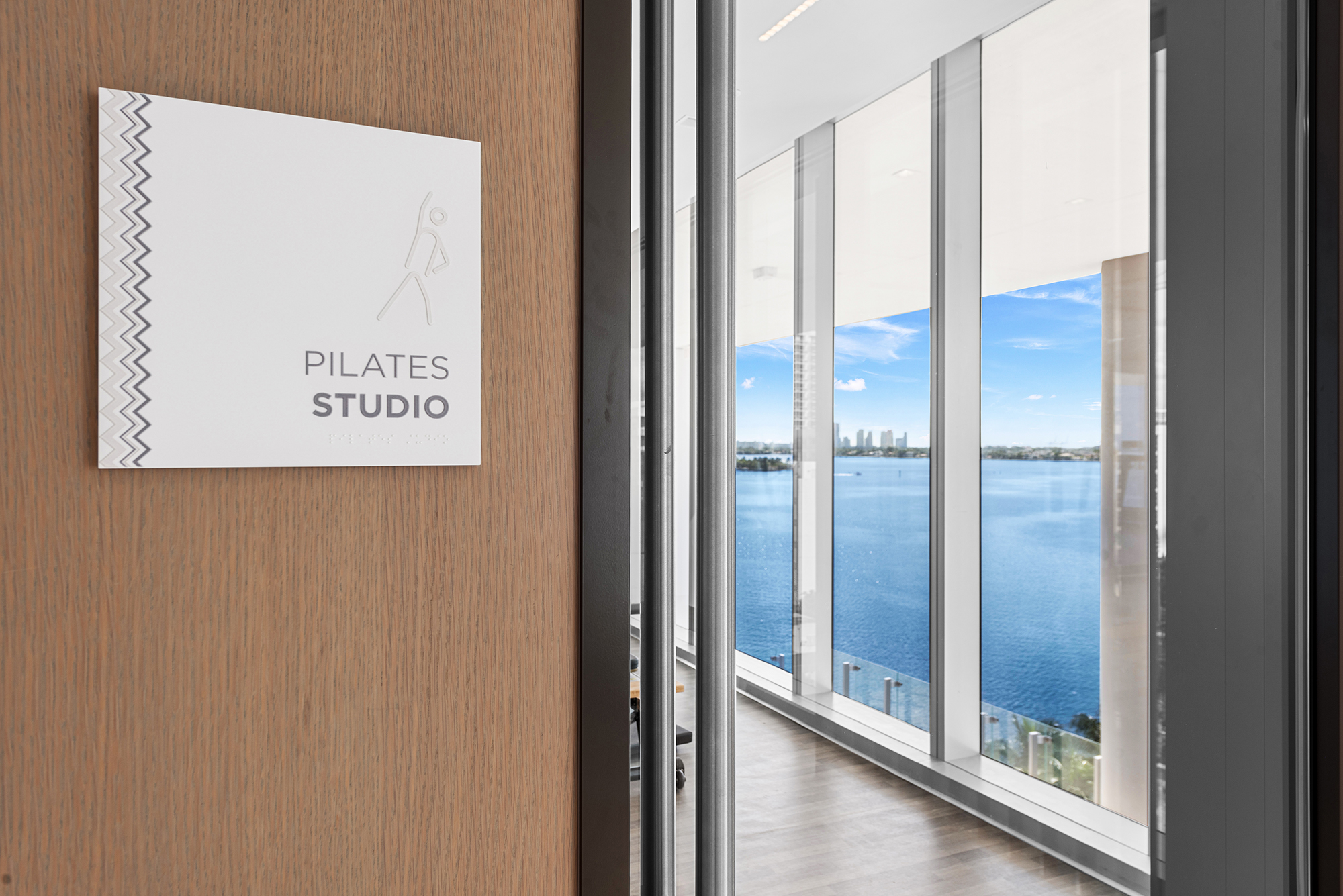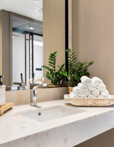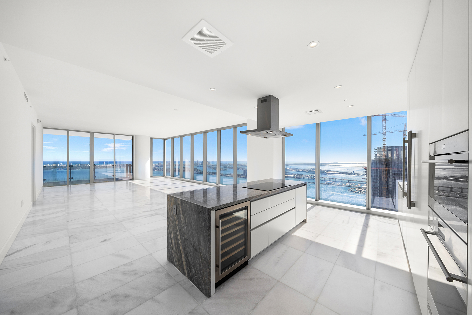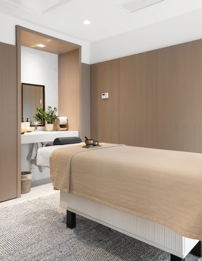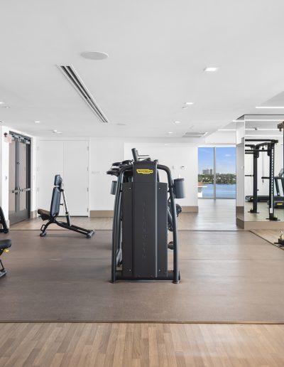 On floors 5 though 7, amenities include a bayfront lounge with a pool overlooking the water; a media room; a beauty salon; a children’s playroom; a pet spa; an expansive gym overlooking the bay; and one of Miami’s largest, resident-only spas. An outdoor bridge connects the sixth floor’s indoor amenities suite to the flow-through pool deck, which includes cabanas, an Olympic-sized lap pool, plunge pools, children’s water features, and an elevated tennis court.