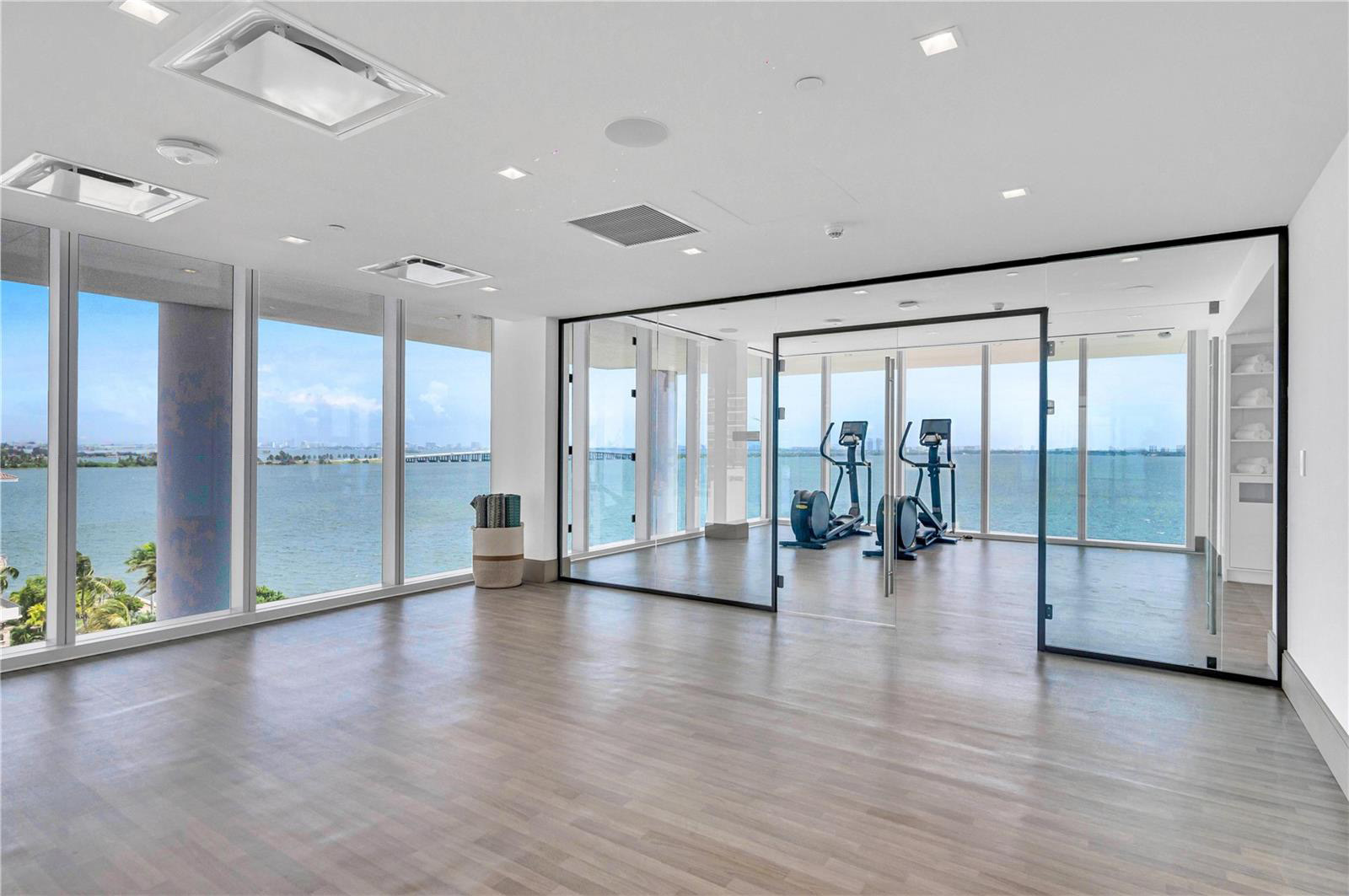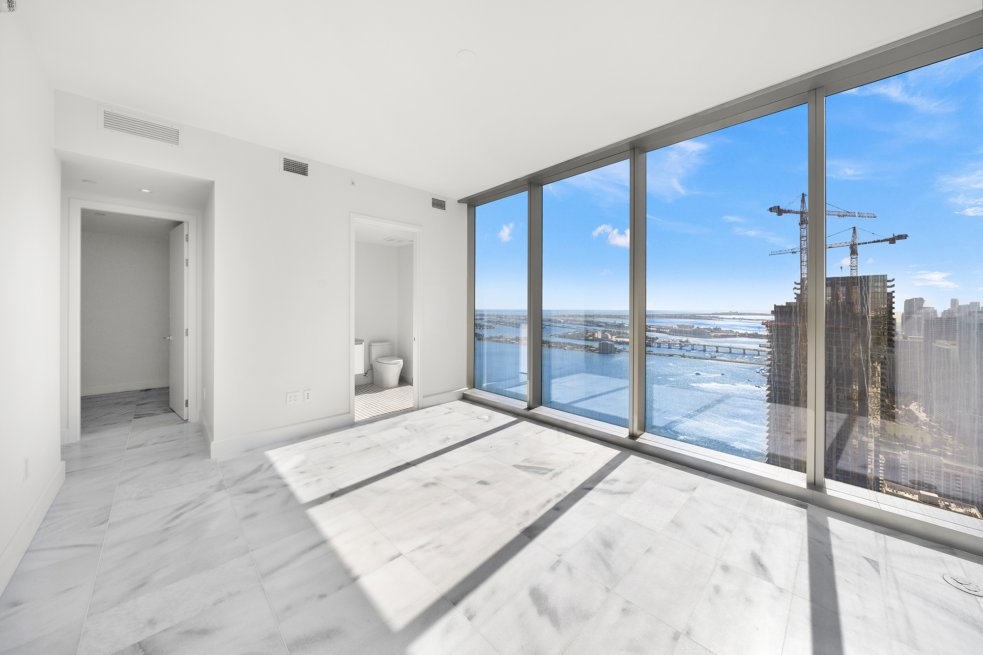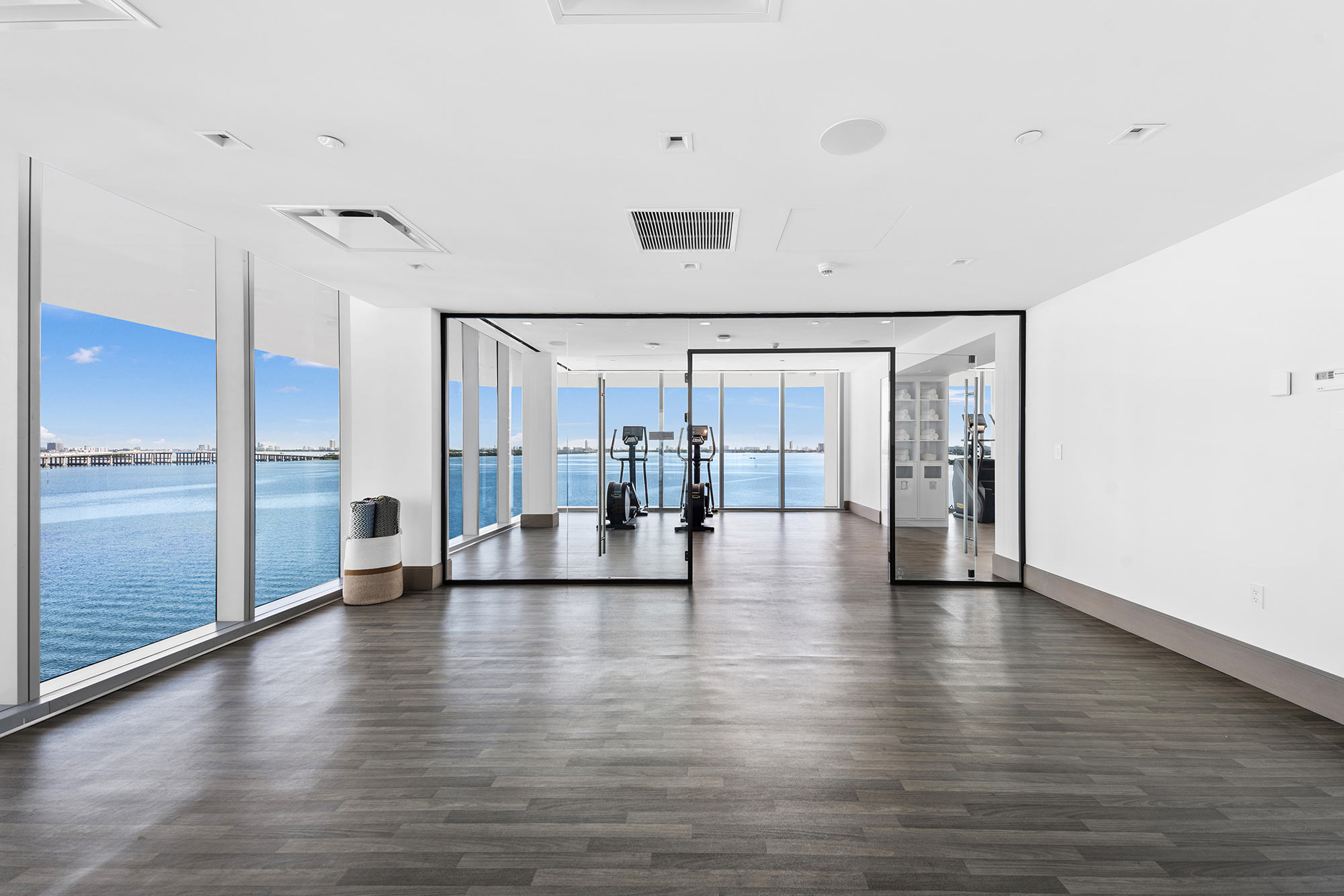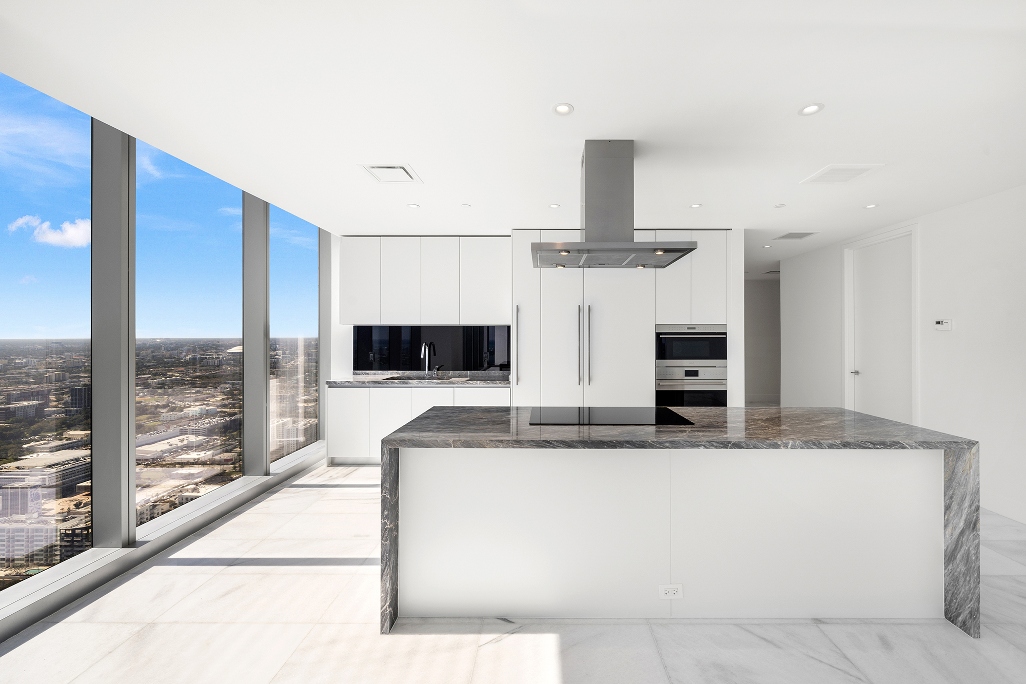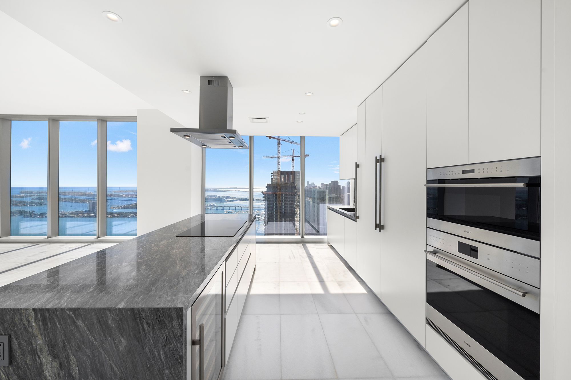 On floors 5 though 7, amenities include a bayfront lounge with a pool overlooking the water; a media room; a beauty salon; a children’s playroom; a pet spa; an expansive gym overlooking the bay; and one of Miami’s largest, resident-only spas. An outdoor bridge connects the sixth floor’s indoor amenities suite to the flow-through pool deck, which includes cabanas, an Olympic-sized lap pool, plunge pools, children’s water features, and an elevated tennis court.