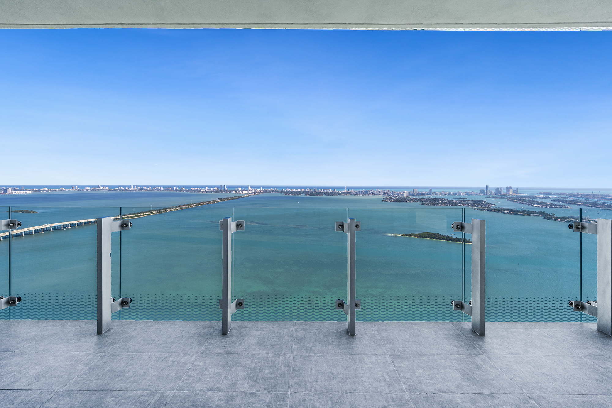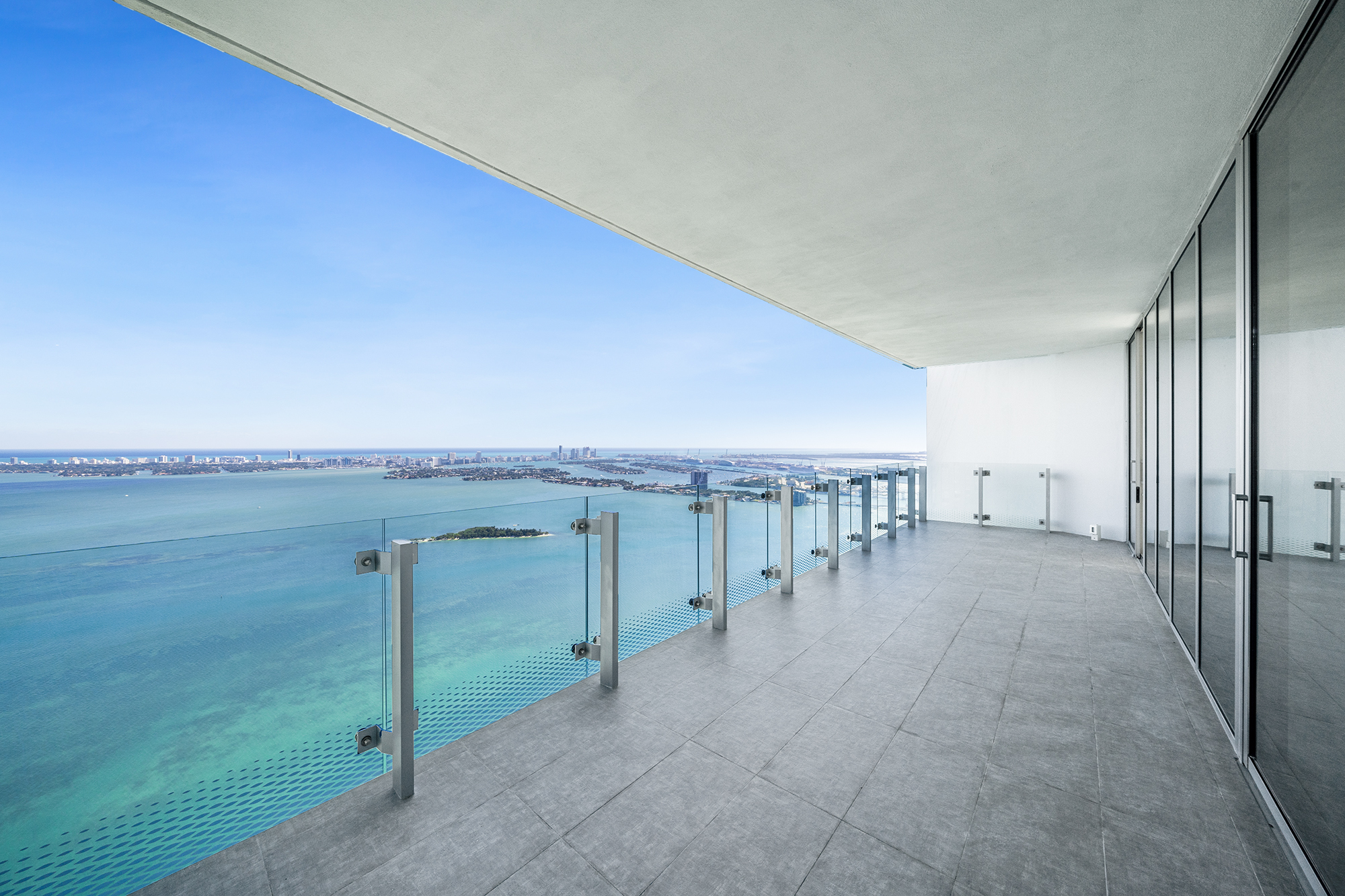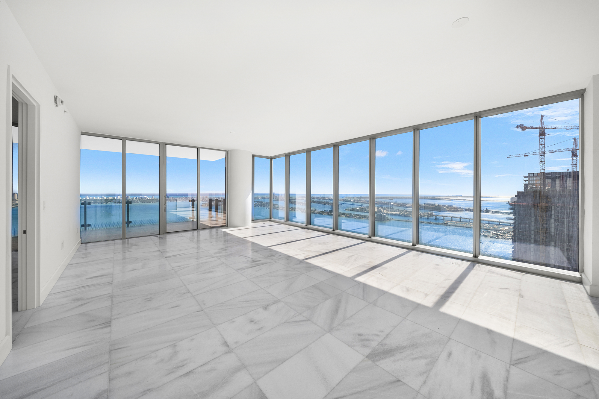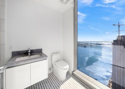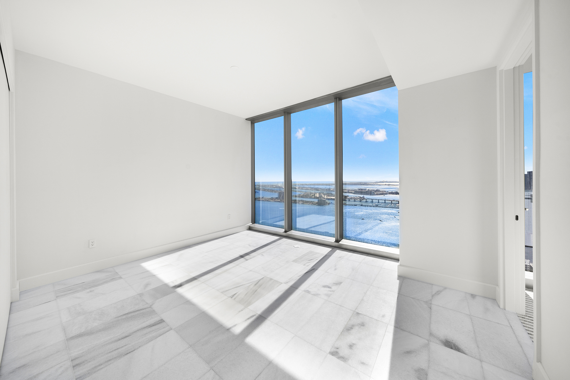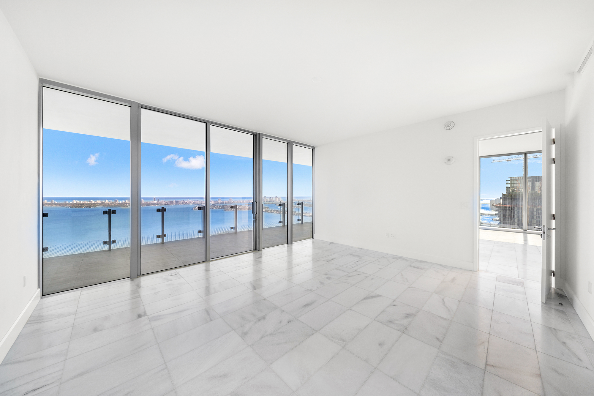 On floors 5 though 7, amenities include a bayfront lounge with a pool overlooking the water; a media room; a beauty salon; a children’s playroom; a pet spa; an expansive gym overlooking the bay; and one of Miami’s largest, resident-only spas. An outdoor bridge connects the sixth floor’s indoor amenities suite to the flow-through pool deck, which includes cabanas, an Olympic-sized lap pool, plunge pools, children’s water features, and an elevated tennis court.