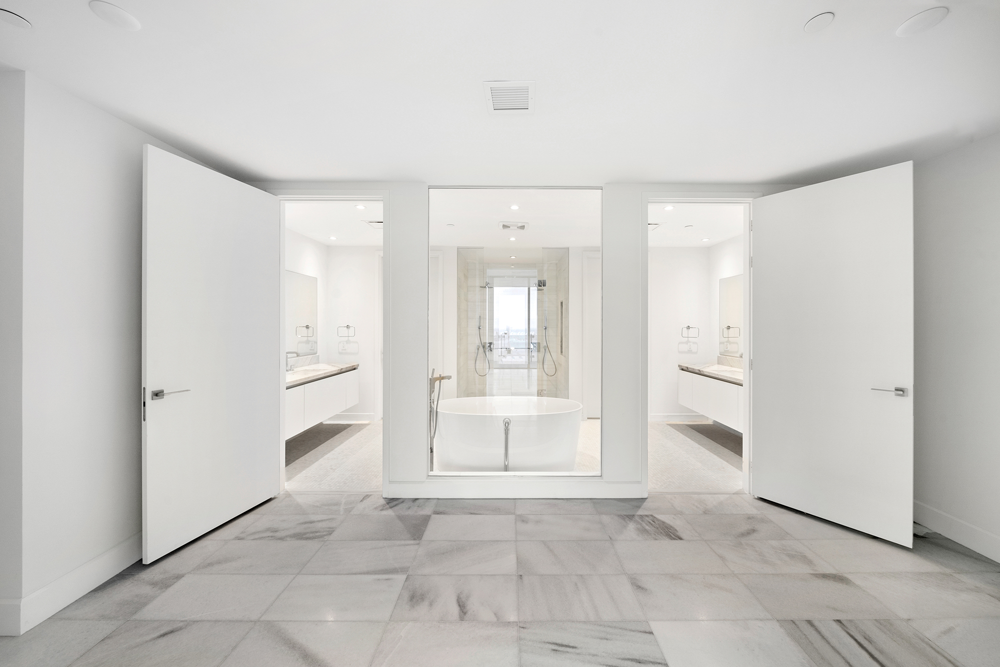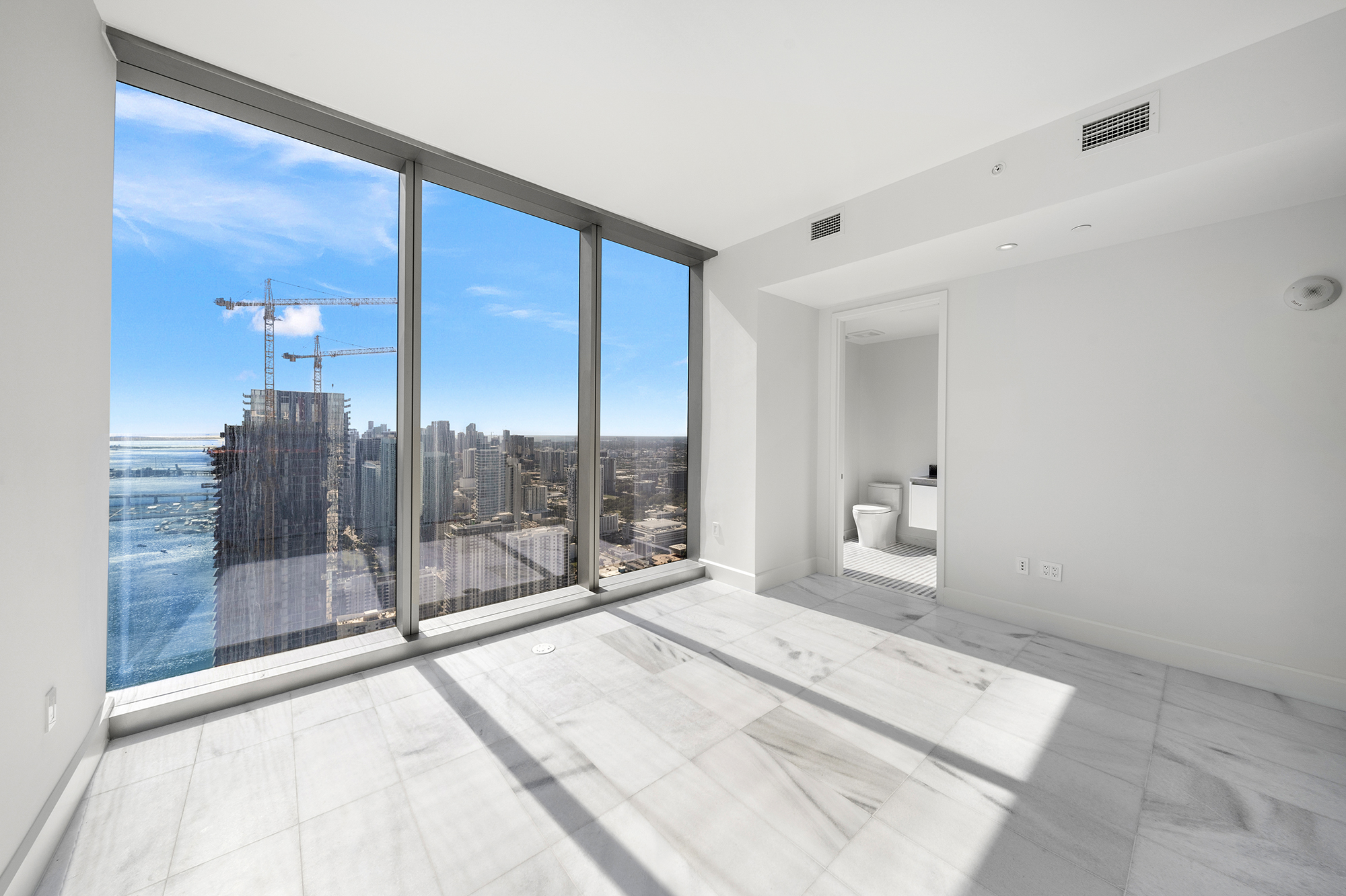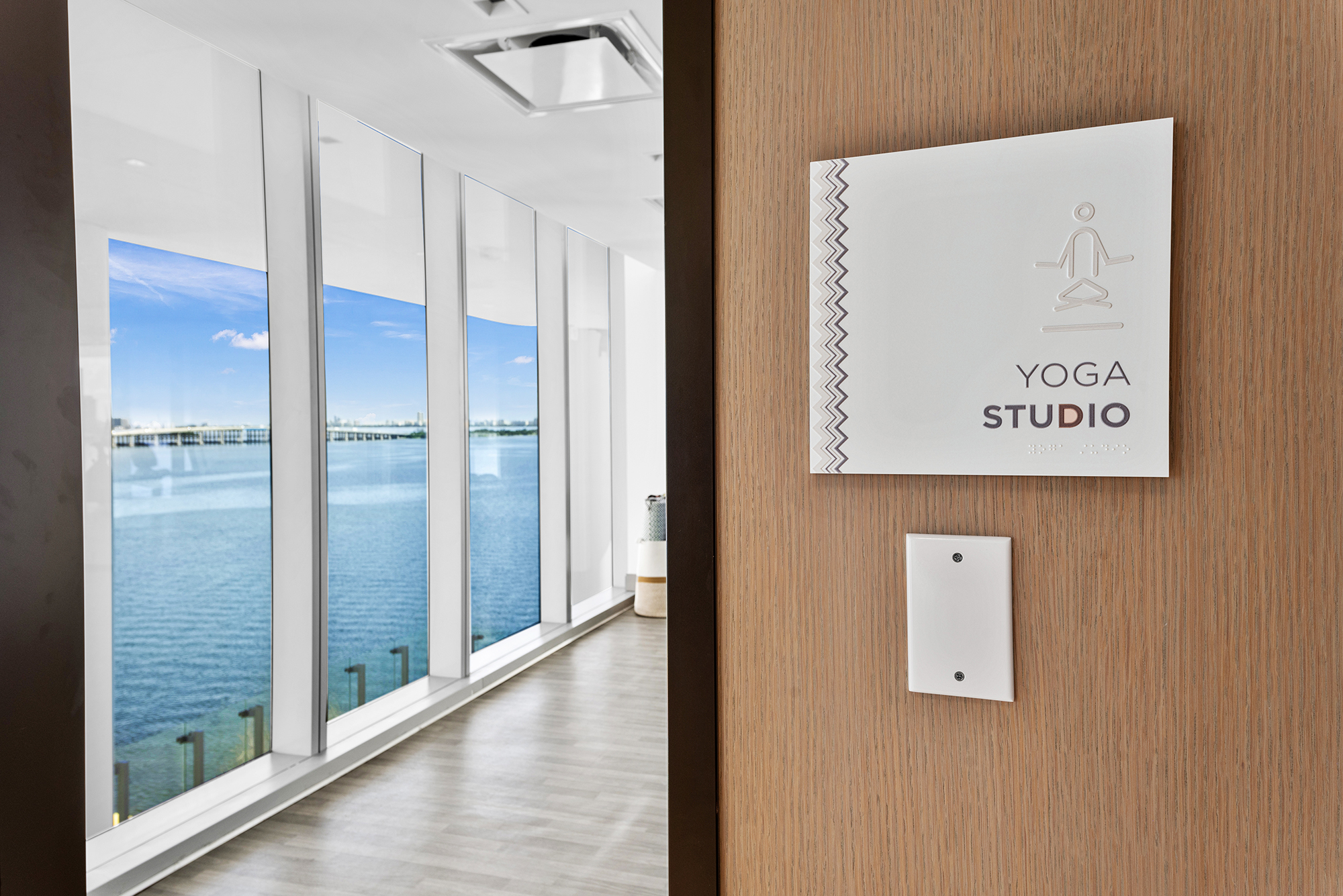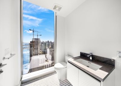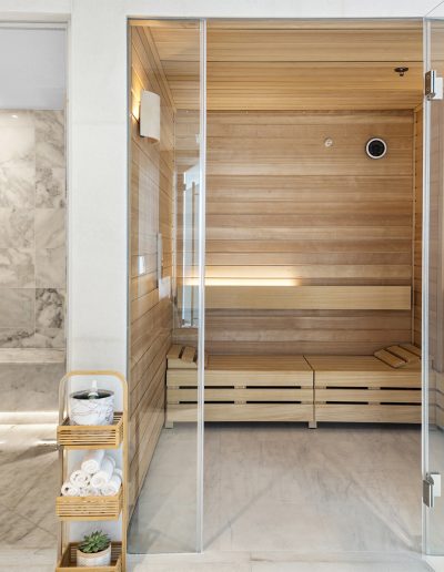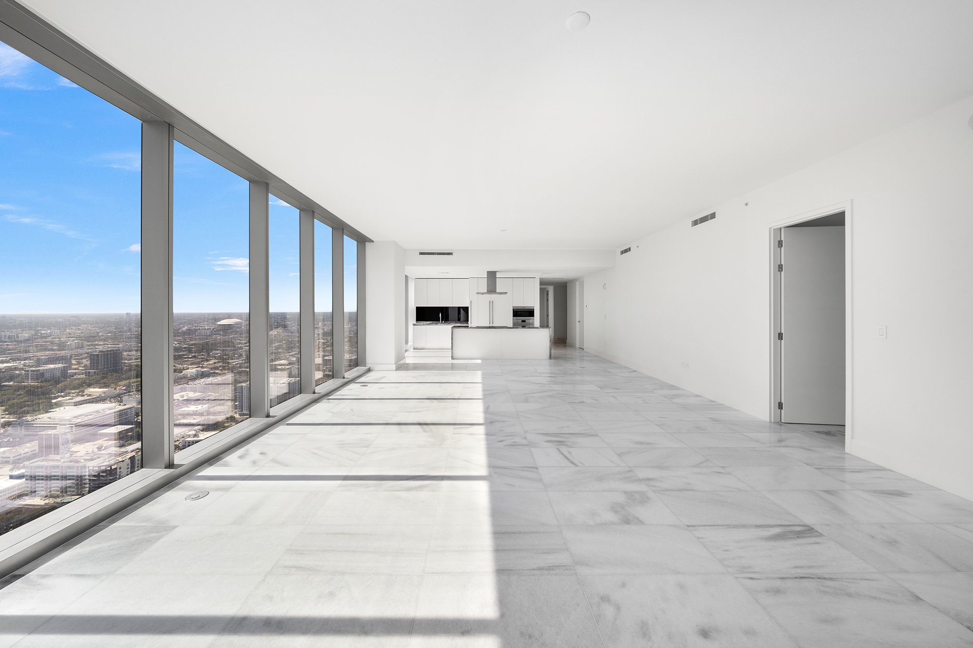 On floors 5 though 7, amenities include a bayfront lounge with a pool overlooking the water; a media room; a beauty salon; a children’s playroom; a pet spa; an expansive gym overlooking the bay; and one of Miami’s largest, resident-only spas. An outdoor bridge connects the sixth floor’s indoor amenities suite to the flow-through pool deck, which includes cabanas, an Olympic-sized lap pool, plunge pools, children’s water features, and an elevated tennis court.