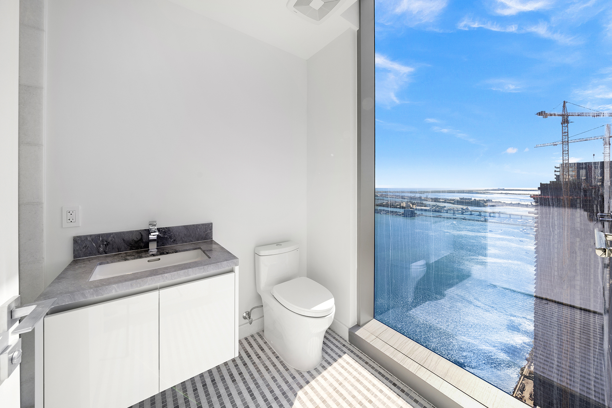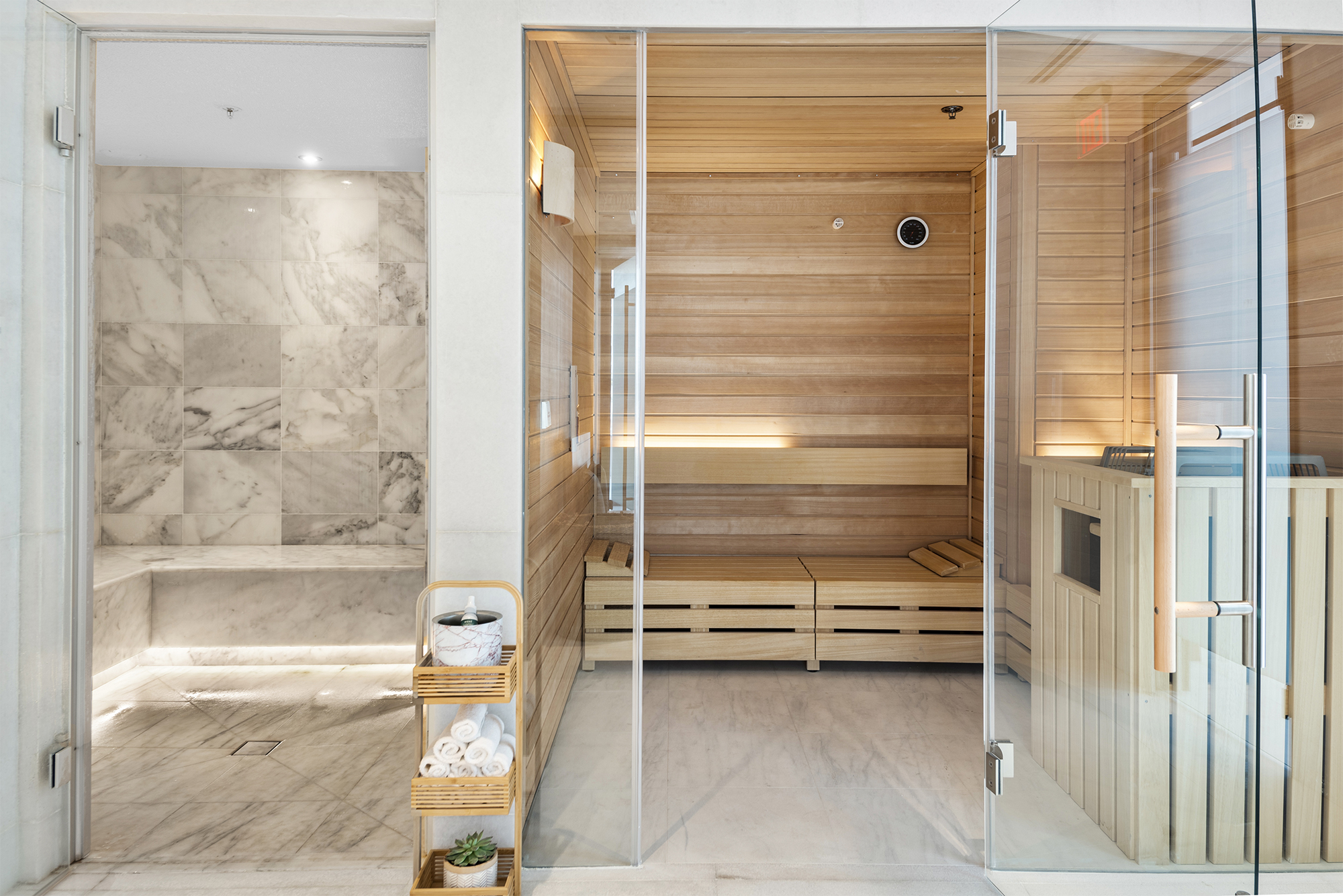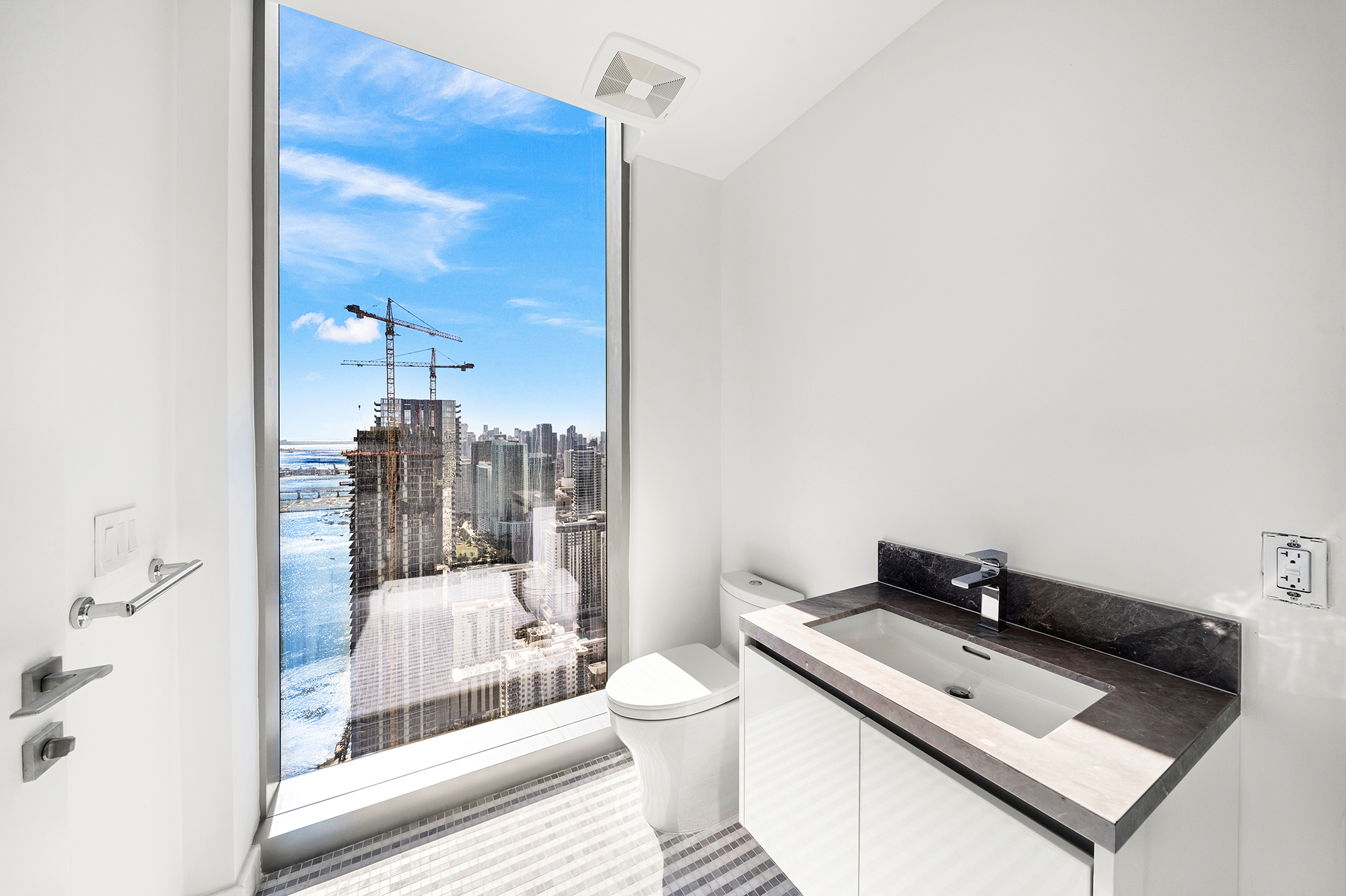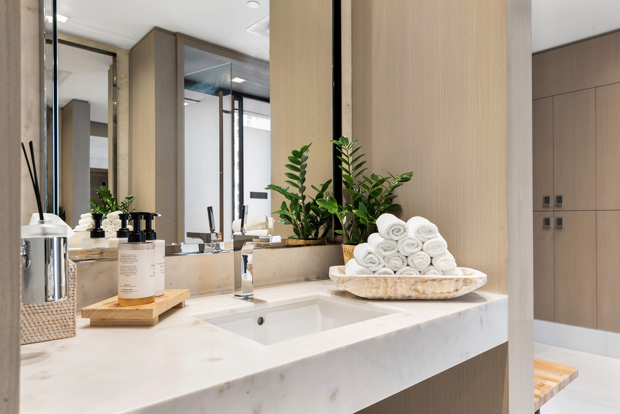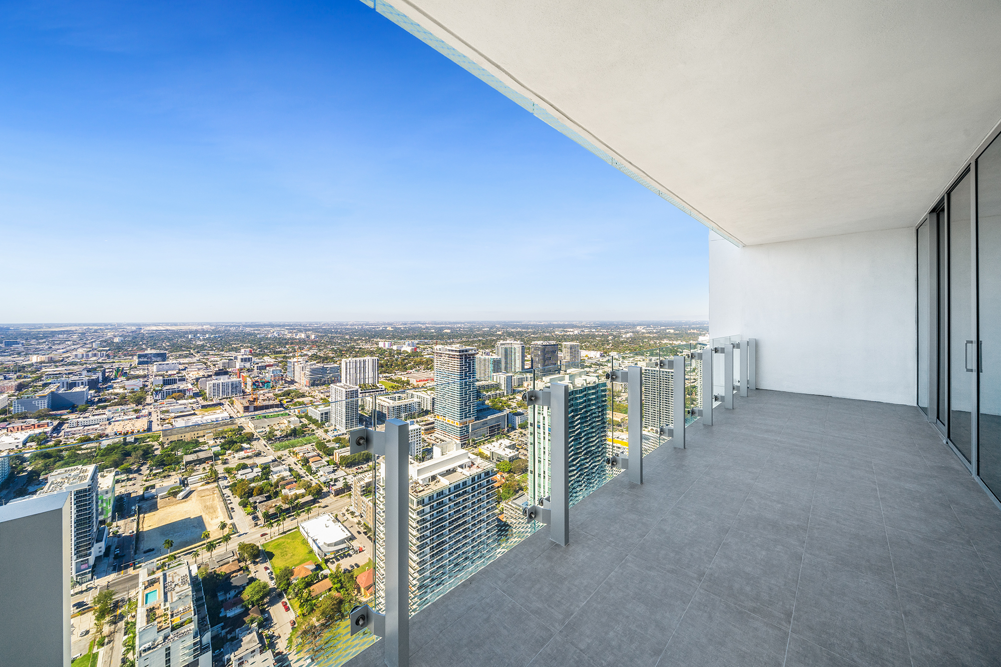 On floors 5 though 7, amenities include a bayfront lounge with a pool overlooking the water; a media room; a beauty salon; a children’s playroom; a pet spa; an expansive gym overlooking the bay; and one of Miami’s largest, resident-only spas. An outdoor bridge connects the sixth floor’s indoor amenities suite to the flow-through pool deck, which includes cabanas, an Olympic-sized lap pool, plunge pools, children’s water features, and an elevated tennis court.